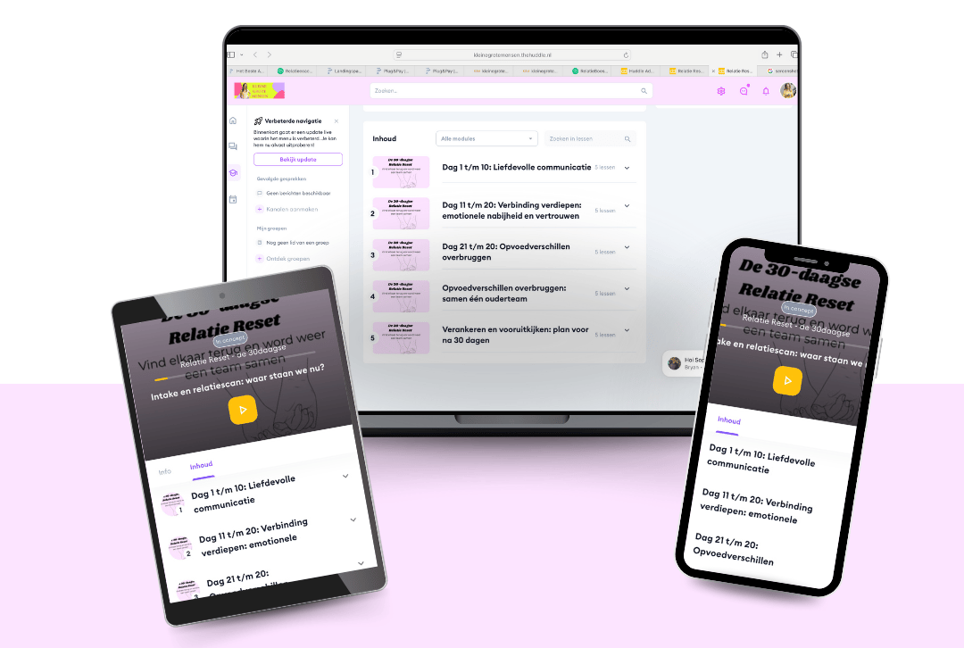 Met de 30-daagse Relatie Reset doorbreek je deze sleur. In kleine, luchtige stappen leer je weer praten zonder in een strijd te belanden, verbinding maken in drukke dagen en samenwerken als ouders in de opvoeding. Jullie relatie voelt weer lichter, hechter en meer als een team, precies de basis die je gezin nodig heeft.